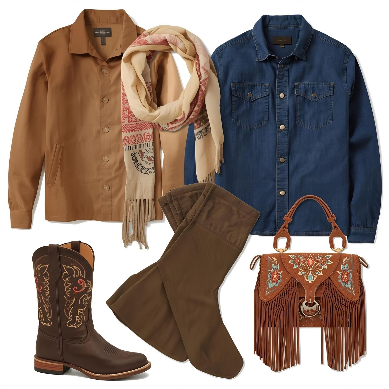 Sticking to warm browns, tans, and dusty olives captures that authentic western vibe. But don’t shy away from bold embroidered or dyed accents that brighten your outfit’s campfire glow.