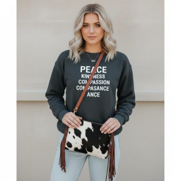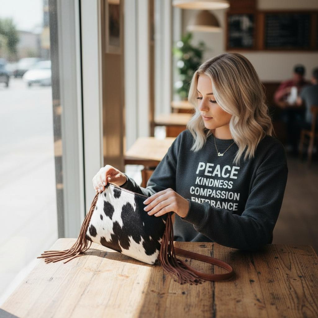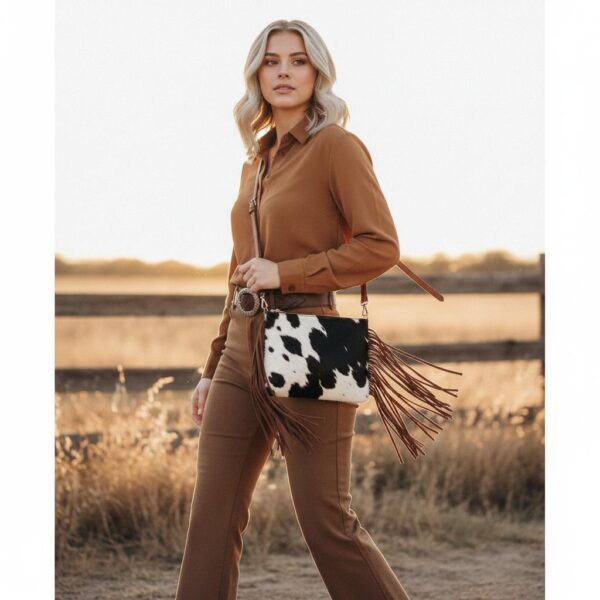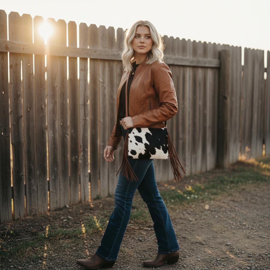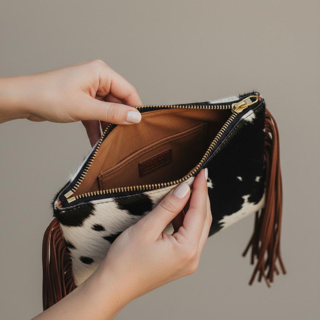 Crafted from premium cowhide leather, this Western-inspired fringe clutch purse combines rustic charm with everyday elegance. Features a zippered closure, interior slip pocket, and double-sided cowhide pattern. Each piece is unique and handmade for a standout look.