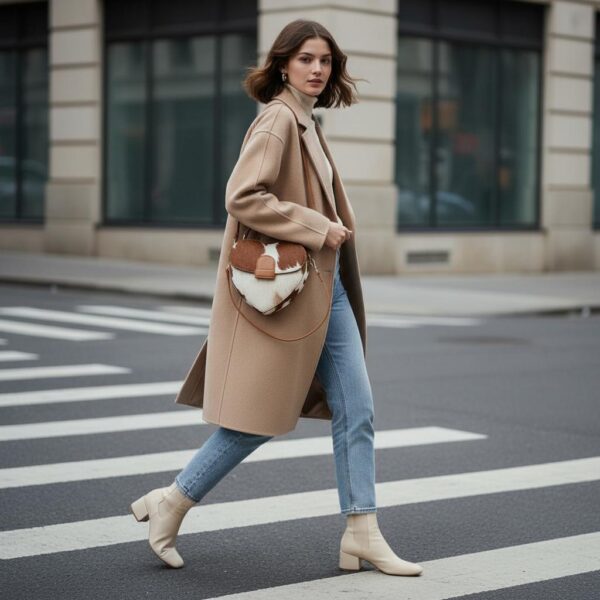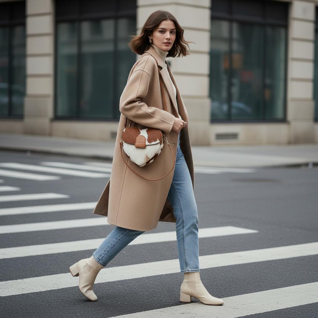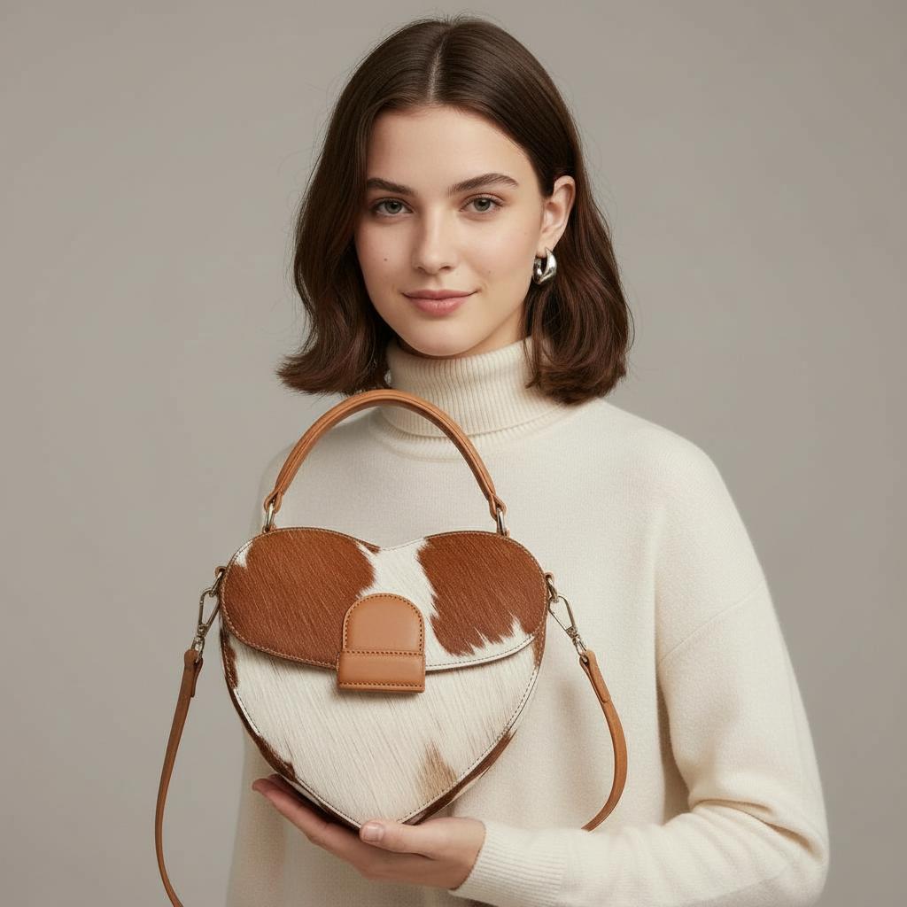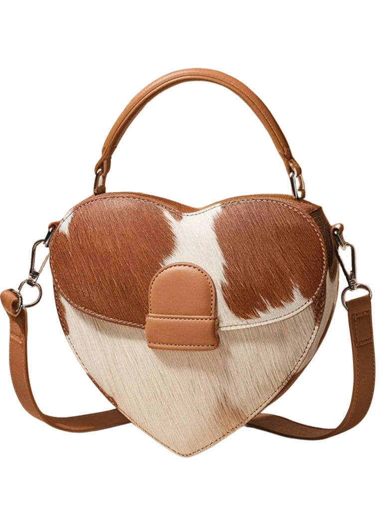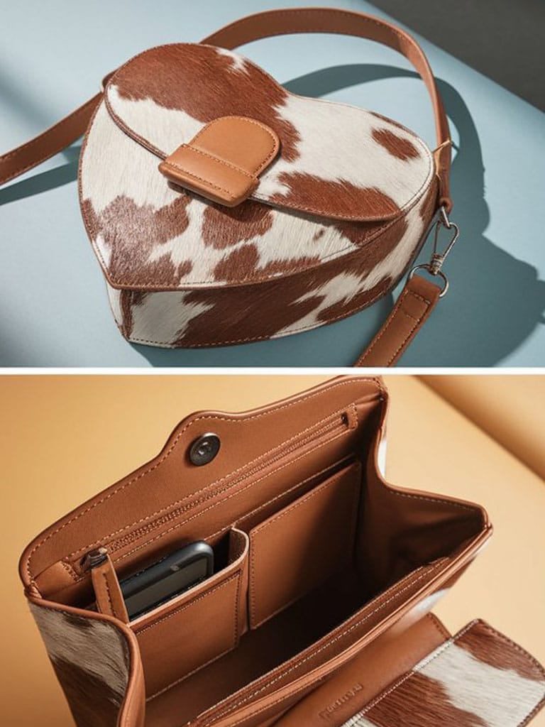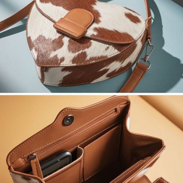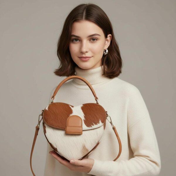 This heart-shaped bag is super unique – I love the cowhide look! The size is pretty decent for essentials, though maybe a little smaller than I first thought. Overall, it’s definitely a fun statement piece that gets compliments.