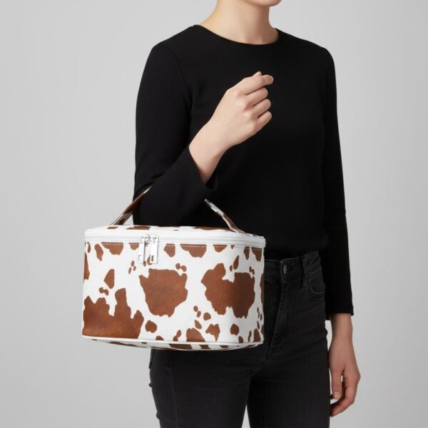 This cow print bag is just adorable! It seems pretty well-made, and the print is definitely fun and eye-catching. It holds a decent amount of stuff, I’m happy with it!