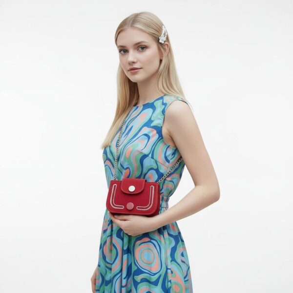 This Crimson Curve Mini Bag is a chic showstopper designed for modern minimalists. Crafted from soft-touch genuine suede in a striking cherry red, it’s finished with contrast rope-style stitching and polished silver-tone hardware for a luxe edge.