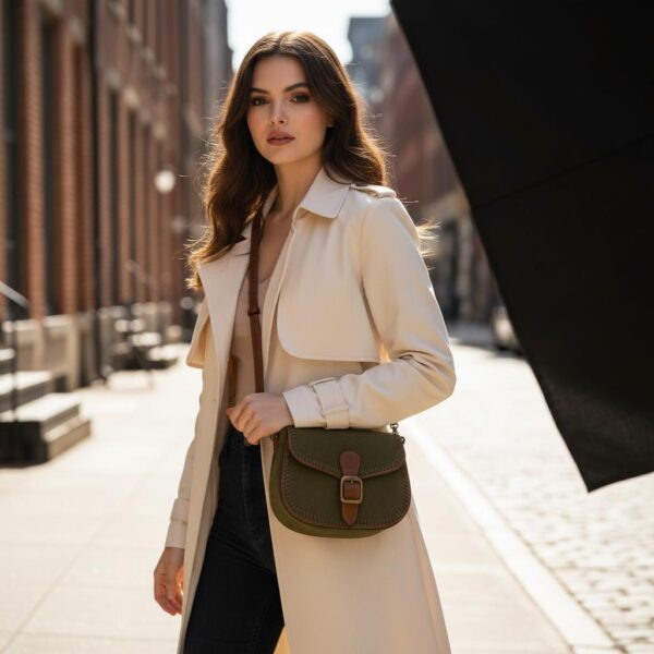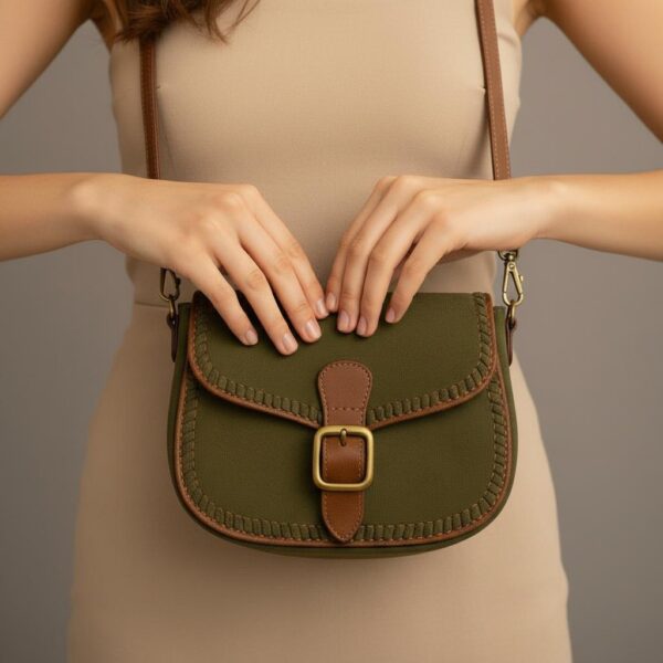 This little saddle bag is super cute! I especially like the deep olive green color paired with the tan trim—it gives it a nice rustic feel. It seems pretty sturdy, though I’m still figuring out the best things to keep in it since it has a set shape. Overall, I’m really happy with this purchase!