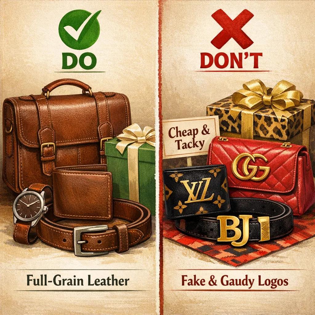 A conceptual illustration of dos and don'ts in choosing leather gifts, contrasting full-grain premium leather items versus low-quality leather with gaudy logos, guiding viewers to make quality choices.