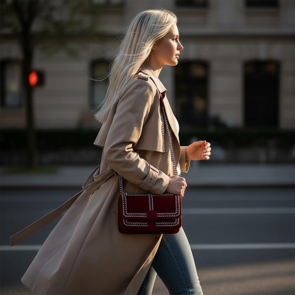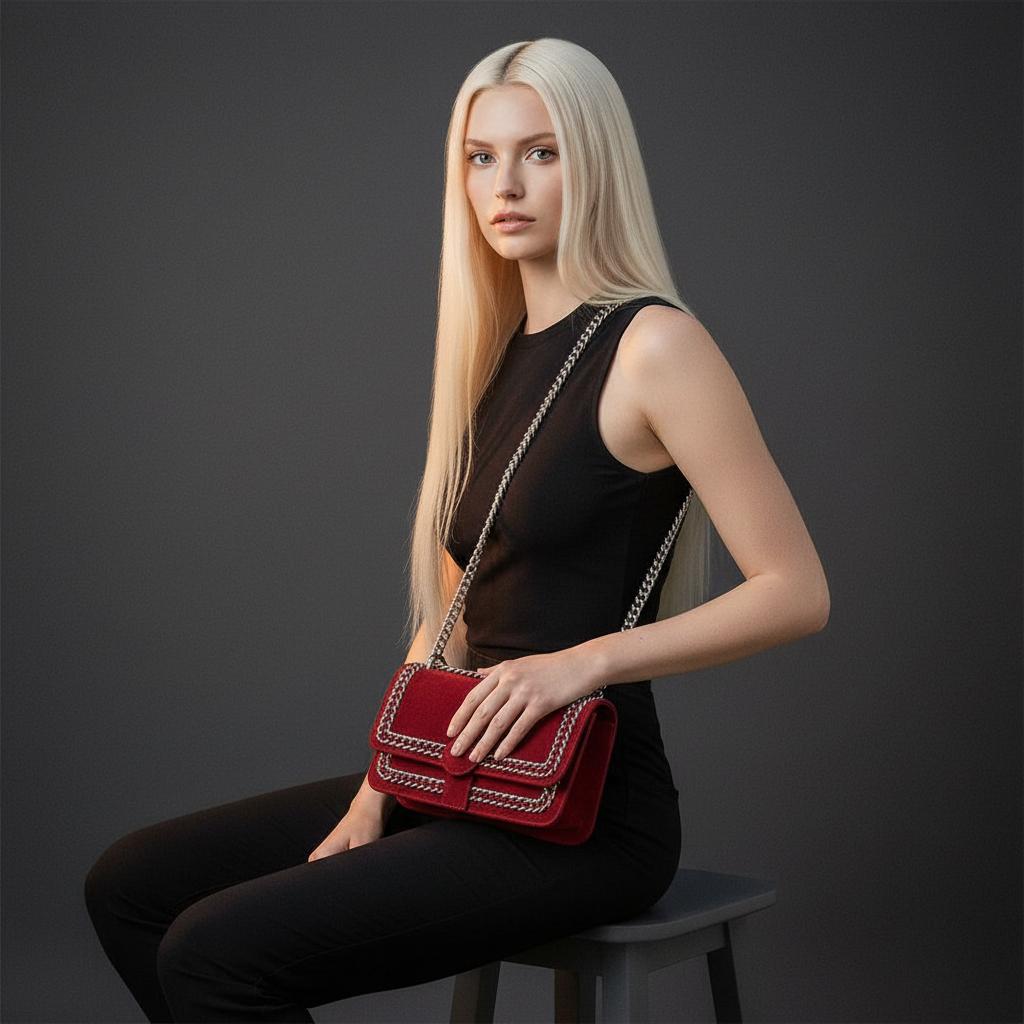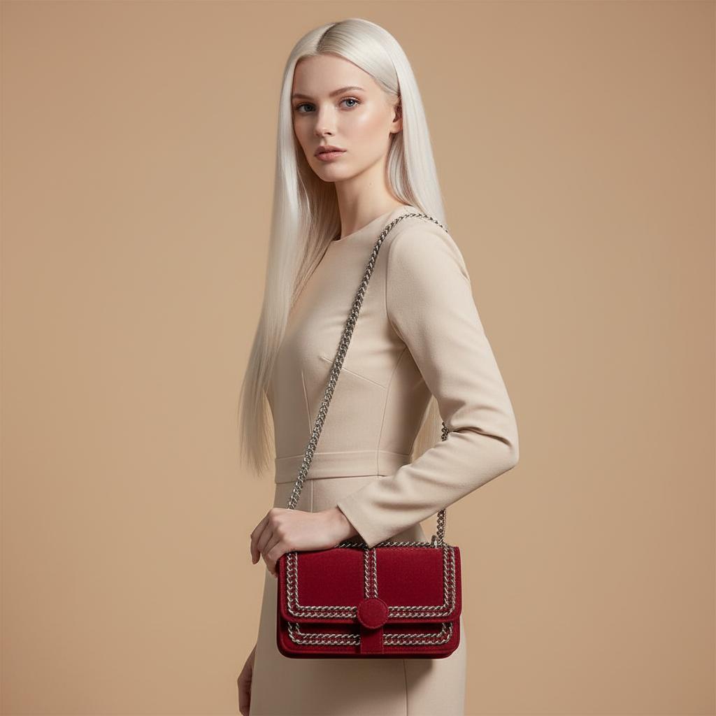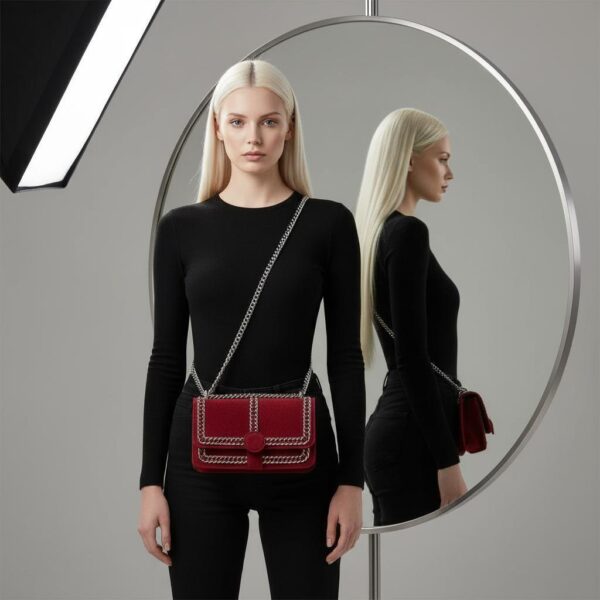 This little red bag is actually really sharp looking! The suede material feels nice, and the silver chain detailing definitely makes it stand out. It’s a good size for just carrying the essentials when you’re heading out. Totally happy with this purchase!